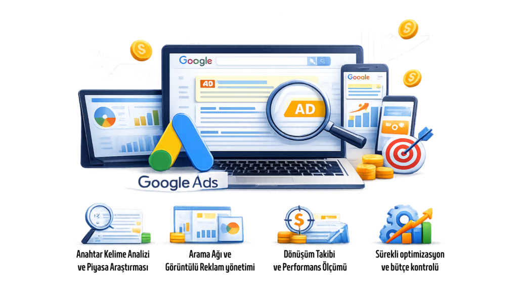Anahtar kelime seçimi, reklam metni, kalite puanı ve bütçe yönetimi birlikte ele alınmalıdır.
